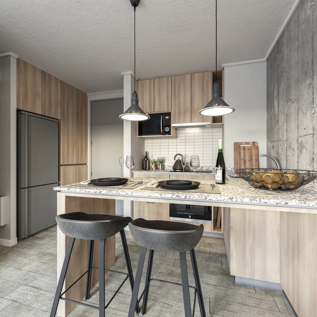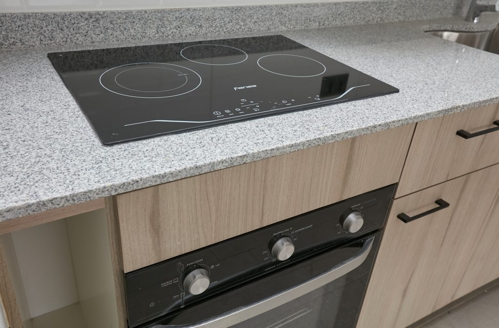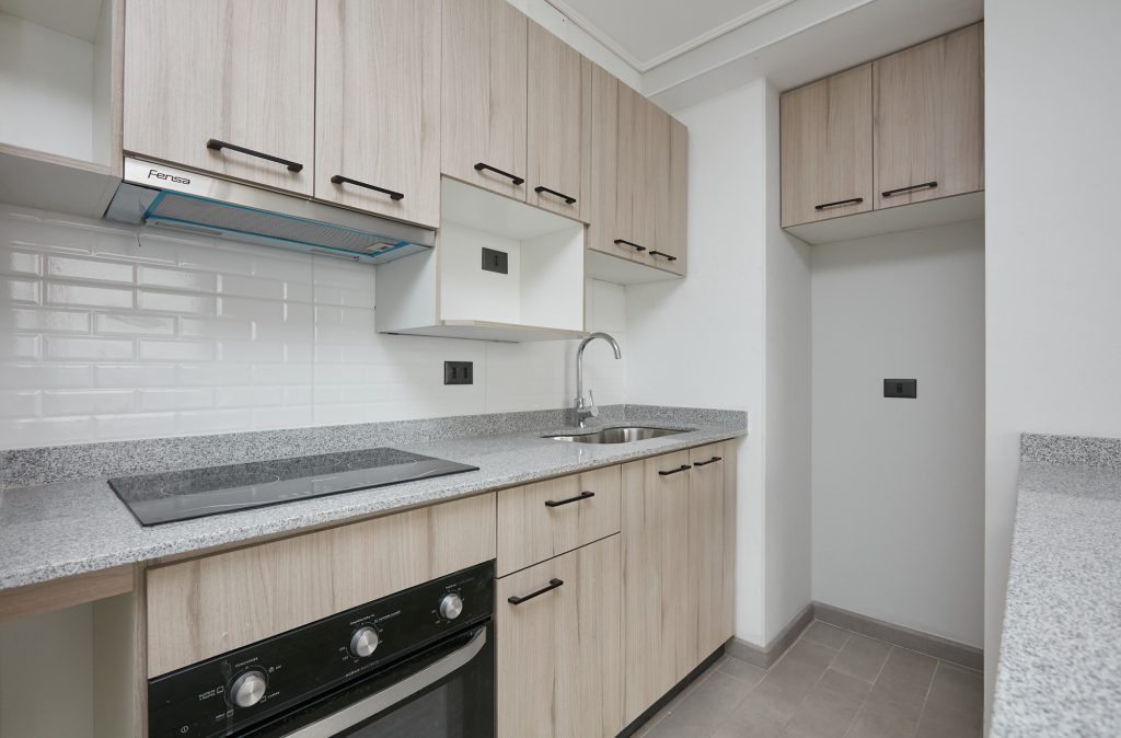 Cocina integrada con muebles de cubierta en granito.